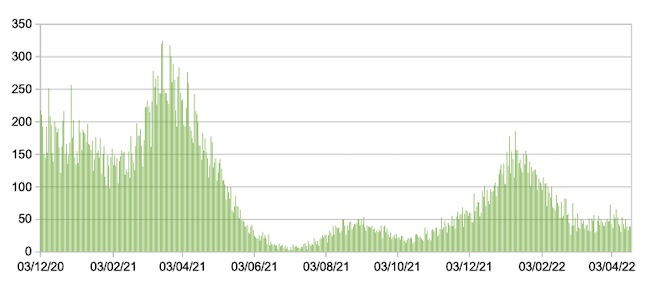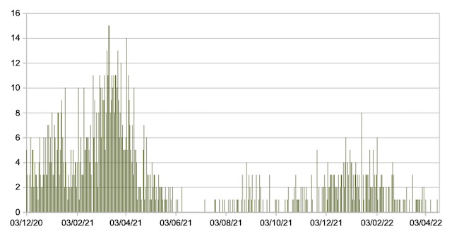 Il grafico seguente mostra i dati giornalieri relativi ai nuovi ingressi in terapia intensiva nelle Marche 3 dicembre 2020 – 19 aprile 2022.