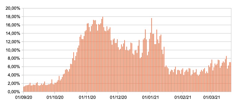 Il grafico mostra la percentuale di tamponi positivi giornalieri su tamponi giornalieri testati ( diagnostici+quelli di controllo) nel periodo 1 settembre 2020 – 19 marzo 2021 in Italia.