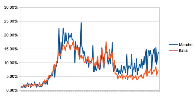 Il grafico seguente illustra l’andamento della percentuale giornaliera di nuovi casi positivi rispetto al corrispondente numero di tamponi (diagnostici +quelli di controllo) effettuati a livello nazionale e nella regione Marche nel periodo 1 settembre 2020 – 19 marzo 2021.