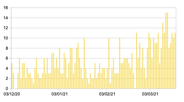 Il grafico seguente mostra i dati giornalieri relativi ai nuovi ingressi in terapia intensiva nelle Marche 3 dicembre 2020 – 19 marzo 2021.