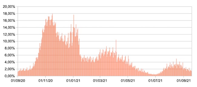 Il grafico mostra la percentuale di tamponi positivi giornalieri su tamponi giornalieri testati ( diagnostici+quelli di controllo) nel periodo 1 settembre 2020 –19 settembre 2021 in Italia.