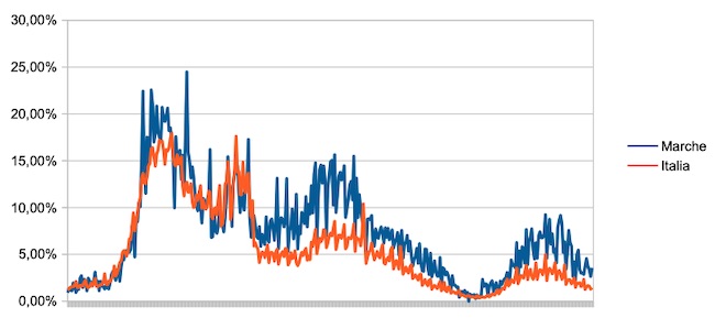 Il grafico seguente illustra l’andamento della percentuale giornaliera di nuovi casi positivi rispetto al corrispondente numero di tamponi (diagnostici +quelli di controllo) effettuati a livello nazionale e nella regione Marche nel periodo 1 settembre 2020 – 19 settembre 2021.