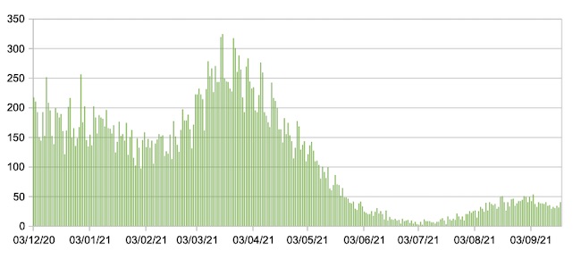 Il grafico seguente mostra i dati giornalieri relativi ai nuovi ingressi in terapia intensiva nelle Marche 3 dicembre 2020 – 19 settembre 2021.