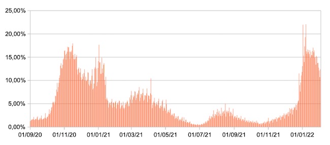 Il grafico mostra la percentuale di tamponi positivi giornalieri su tamponi giornalieri testati ( diagnostici+quelli di controllo) nel periodo 1 settembre 2020 – 2 febbraio 2022 in Italia.