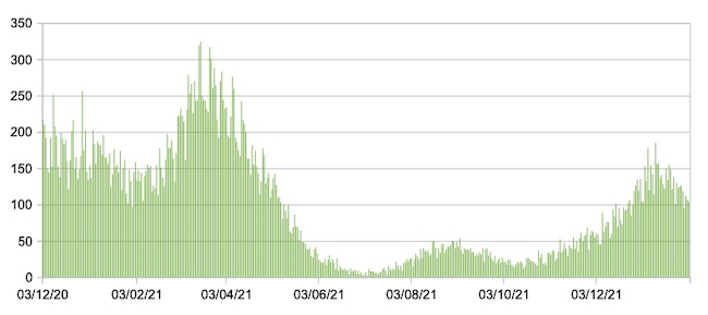 Il grafico seguente mostra i dati giornalieri relativi ai nuovi ingressi in terapia intensiva nelle Marche 3 dicembre 2020 – 2 febbraio 2022.