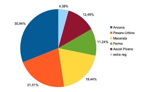 1346 in provincia di Ancona, 1075 in provincia di Pesaro-Urbino, 1201 nella provincia di Macerata,539 nella provincia di Fermo,541 nella provincia di Ascoli Piceno,209 residenti fuori regione