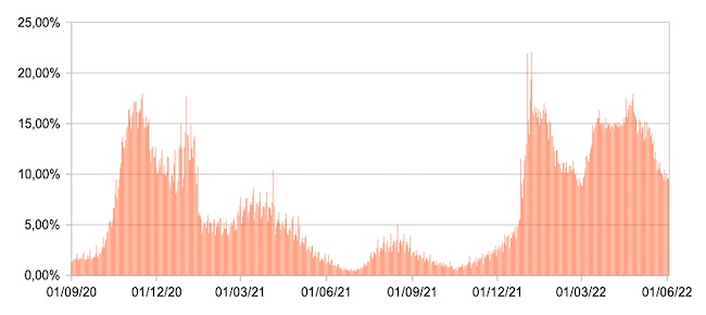 Il grafico mostra la percentuale di tamponi positivi giornalieri su tamponi giornalieri testati ( diagnostici+quelli di controllo) nel periodo 1 settembre 2020 – 2 giugno 2022 in Italia.
