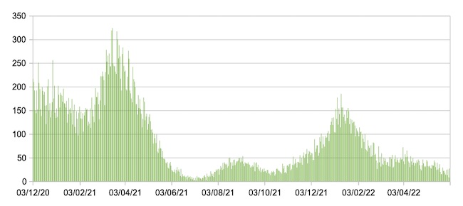 Nel grafico sono riportati i valori medi settimanali.Il valore medio della settimana 22/5/22-28/5/22 è 321,16(la scorsa settimana era 466,70).