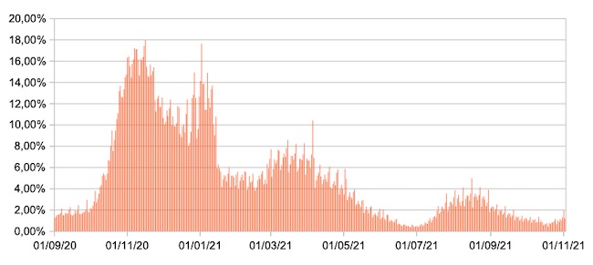 Il grafico mostra la percentuale di tamponi positivi giornalieri su tamponi giornalieri testati ( diagnostici+quelli di controllo) nel periodo 1 settembre 2020 –2 novembre 2021 in Italia.