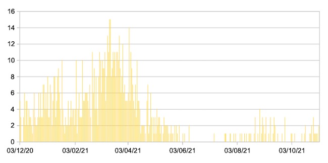 Il grafico seguente mostra i dati giornalieri relativi ai nuovi ingressi in terapia intensiva nelle Marche 3 dicembre 2020 – 2 novembre 2021.