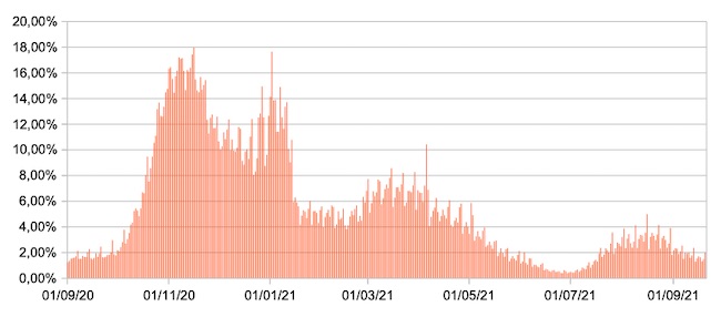 Il grafico mostra la percentuale di tamponi positivi giornalieri su tamponi giornalieri testati ( diagnostici+quelli di controllo) nel periodo 1 settembre 2020 –20 settembre 2021 in Italia.