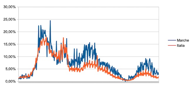 Il grafico seguente illustra l’andamento della percentuale giornaliera di nuovi casi positivi rispetto al corrispondente numero di tamponi (diagnostici +quelli di controllo) effettuati a livello nazionale e nella regione Marche nel periodo 1 settembre 2020 – 20 settembre 2021.