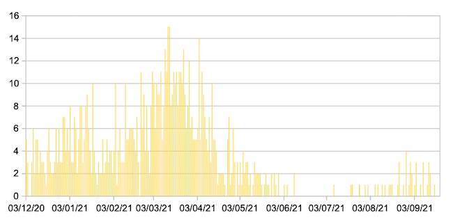 Il grafico seguente mostra i dati giornalieri relativi ai nuovi ingressi in terapia intensiva nelle Marche 3 dicembre 2020 – 20 settembre 2021.