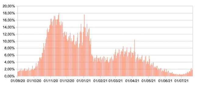 Il grafico mostra la percentuale di tamponi positivi giornalieri su tamponi giornalieri testati ( diagnostici+quelli di controllo) nel periodo 1 settembre 2020 – 21 luglio 2021 in Italia.