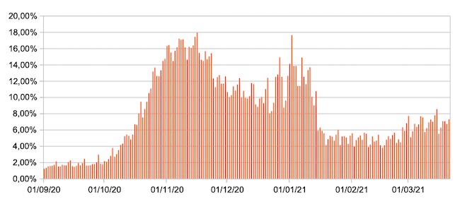 Il grafico mostra la percentuale di tamponi positivi giornalieri su tamponi giornalieri testati ( diagnostici+quelli di controllo) nel periodo 1 settembre 2020 – 21 marzo 2021 in Italia.