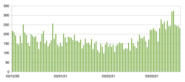 Il grafico seguente mostra i dati giornalieri relativi ai nuovi ingressi in terapia intensiva nelle Marche 3 dicembre 2020 – 21 marzo 2021.