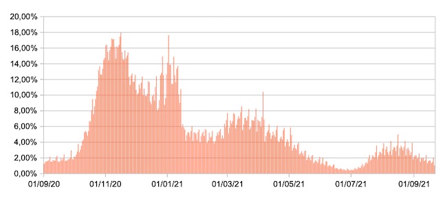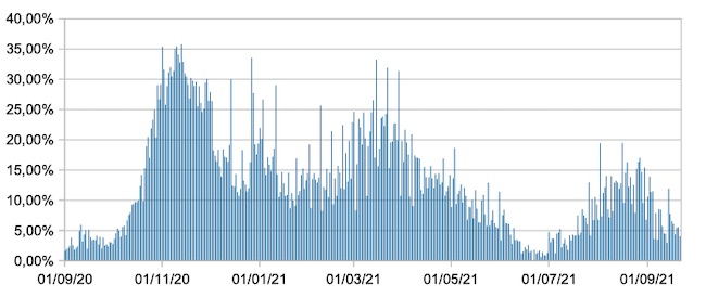 Il grafico mostra la percentuale di tamponi positivi giornalieri su tamponi giornalieri testati ( diagnostici+quelli di controllo) nel periodo 1 settembre 2020 –21 settembre 2021 in Italia.