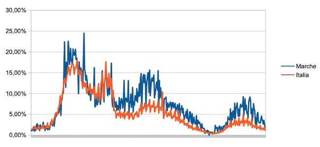 Il grafico seguente illustra l’andamento della percentuale giornaliera di nuovi casi positivi rispetto al corrispondente numero di tamponi (diagnostici +quelli di controllo) effettuati a livello nazionale e nella regione Marche nel periodo 1 settembre 2020 – 21 settembre 2021.