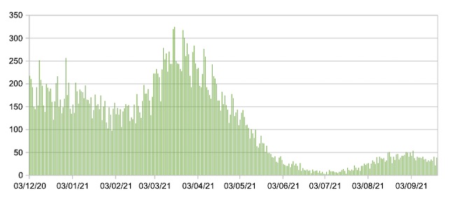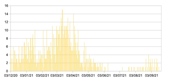 Il grafico seguente mostra i dati giornalieri relativi ai nuovi ingressi in terapia intensiva nelle Marche 3 dicembre 2020 – 21 settembre 2021.