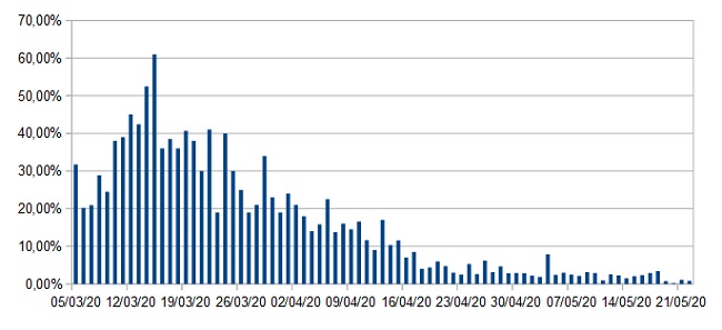 Dopo il brusco aumento dei contagi del 4 maggio per altro motivato dal fatto che tale dato relativo ai tamponi raggruppava casi del 29, del 30 aprile, dell’1 e del 2 maggio, i valori degli ultimi giorni rientrano nell’ottica del rallentamento della curva epidemiologica. Dal 18 aprile infatti gli incrementi giornalieri oscillano dallo 0,2% al 6% segno che il contagio sta perdendo vigore. Altri segnali significativi di una tendenza positiva vengono dal numero di dimessi/guariti che cresce di giorno in giorno e dal calo di terapie intensive e nuovi ricoveri.Siamo sulla strada giusta, ma bisogna continuare a rispettare le regole affinché si possano avere risultati sempre più confortanti.
