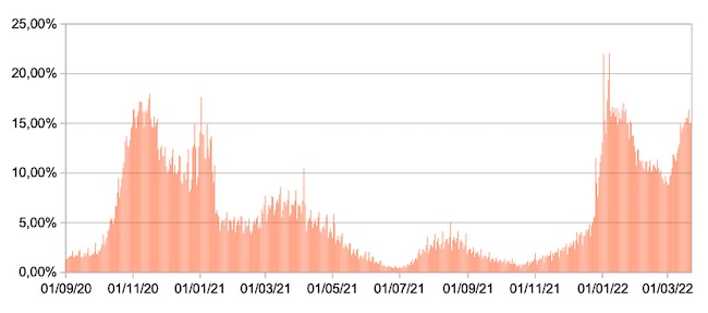 Il grafico mostra la percentuale di tamponi positivi giornalieri su tamponi giornalieri testati ( diagnostici+quelli di controllo) nel periodo 1 settembre 2020 – 22 marzo 2022 in Italia.
