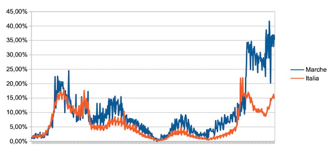 Il grafico seguente illustra l’andamento della percentuale giornaliera di nuovi casi positivi rispetto al corrispondente numero di tamponi (diagnostici +quelli di controllo) effettuati a livello nazionale e nella regione Marche nel periodo 1 settembre 2020 – 22 marzo 2022.