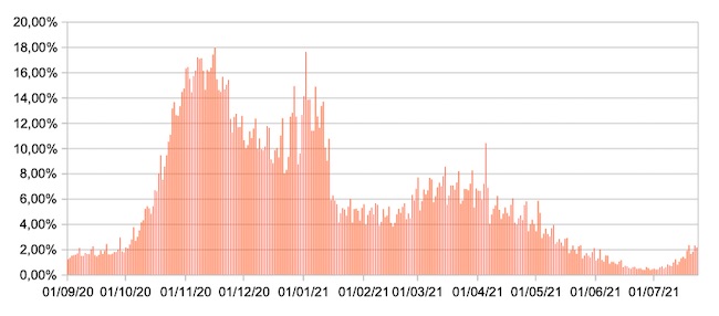 Il grafico mostra la percentuale di tamponi positivi giornalieri su tamponi giornalieri testati ( diagnostici+quelli di controllo) nel periodo 1 settembre 2020 – 23 luglio 2021 in Italia.