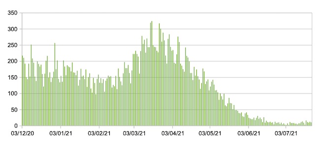 Il grafico seguente mostra i dati giornalieri ,a livello nazionale, relativi ai nuovi ingressi in terapia intensiva 3 dicembre 2020 – 23 luglio 2021
