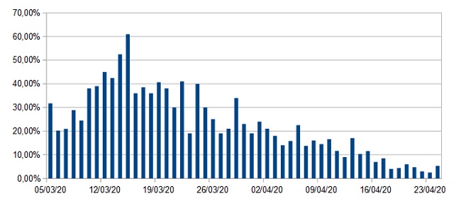 Il bollettino Gores aggiornato a venerdì 24 aprile 2020: su 1440 campioni analizzati 76 risultano positivi. Il grafico sull’andamento dei contagi giornalieri