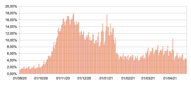 Il grafico mostra la percentuale di tamponi positivi giornalieri su tamponi giornalieri testati ( diagnostici+quelli di controllo) nel periodo 1 settembre 2020 – 24 aprile 2021 in Italia.