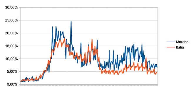 Il grafico seguente illustra l’andamento della percentuale giornaliera di nuovi casi positivi rispetto al corrispondente numero di tamponi (diagnostici +quelli di controllo) effettuati a livello nazionale e nella regione Marche nel periodo 1 settembre 2020 – 24 aprile 2021.