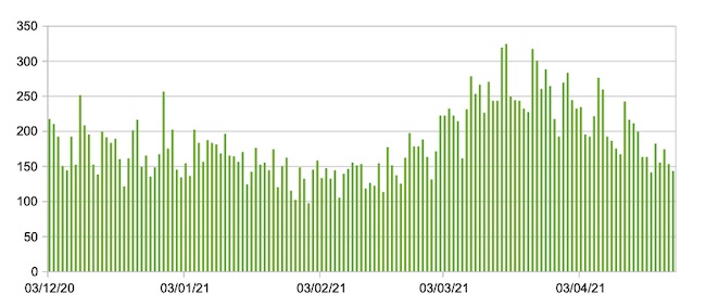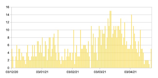 Il grafico seguente mostra i dati giornalieri relativi ai nuovi ingressi in terapia intensiva nelle Marche 3 dicembre 2020 – 24 aprile 2021.