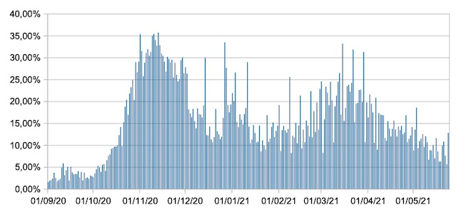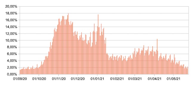 Il grafico mostra la percentuale di tamponi positivi giornalieri su tamponi giornalieri testati ( diagnostici+quelli di controllo) nel periodo 1 settembre 2020 – 24 maggio 2021 in Italia.