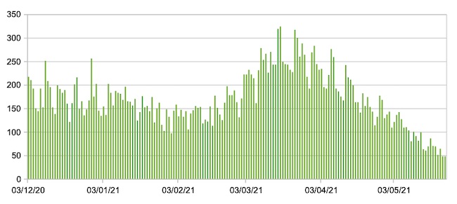 Il grafico seguente mostra i dati giornalieri relativi ai nuovi ingressi in terapia intensiva nelle Marche 3 dicembre 2020 – 24 maggio 2021