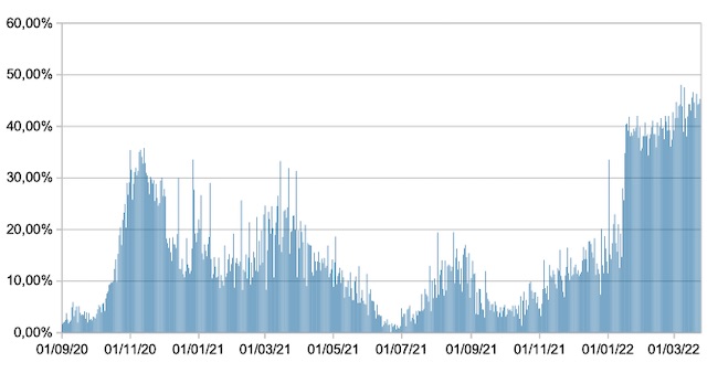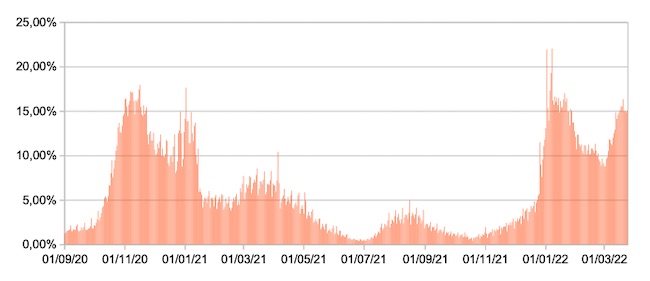 Il grafico mostra la percentuale di tamponi positivi giornalieri su tamponi giornalieri testati ( diagnostici+quelli di controllo) nel periodo 1 settembre 2020 – 24 marzo 2022 in Italia.