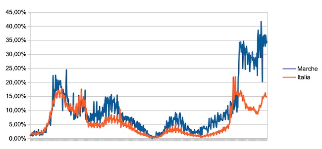 Il grafico seguente illustra l’andamento della percentuale giornaliera di nuovi casi positivi rispetto al corrispondente numero di tamponi (diagnostici +quelli di controllo) effettuati a livello nazionale e nella regione Marche nel periodo 1 settembre 2020 – 24 marzo 2022.