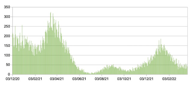 Il grafico seguente mostra i dati giornalieri relativi ai nuovi ingressi in terapia intensiva nelle Marche 3 dicembre 2020 – 24 marzo 2022.