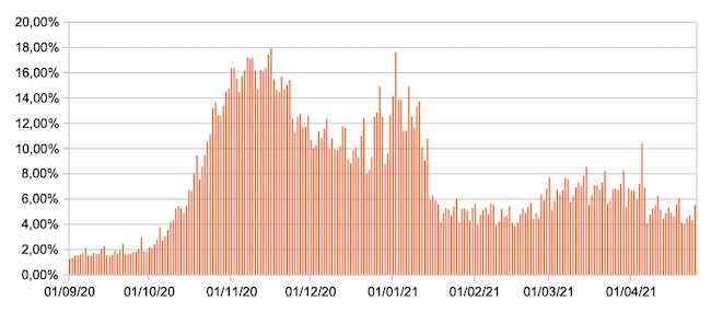 Il grafico mostra la percentuale di tamponi positivi giornalieri su tamponi giornalieri testati ( diagnostici+quelli di controllo) nel periodo 1 settembre 2020 – 25 aprile 2021 in Italia.