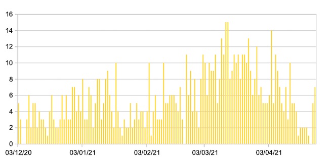 Il grafico seguente mostra i dati giornalieri relativi ai nuovi ingressi in terapia intensiva nelle Marche 3 dicembre 2020 – 25 aprile 2021.
