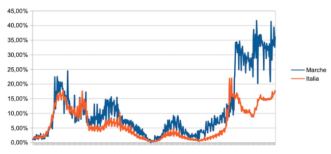 Il grafico seguente illustra l’andamento della percentuale giornaliera di nuovi casi positivi rispetto al corrispondente numero di tamponi (diagnostici +quelli di controllo) effettuati a livello nazionale e nella regione Marche nel periodo 1 settembre 2020 – 25 aprile 2022.