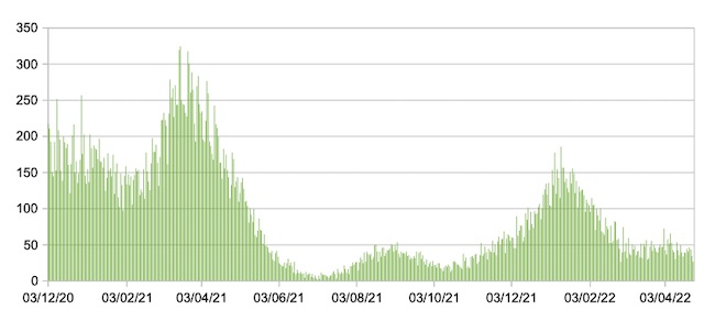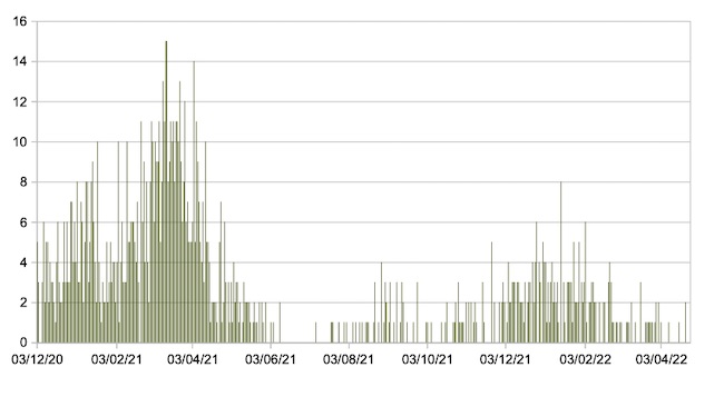Il grafico seguente mostra i dati giornalieri relativi ai nuovi ingressi in terapia intensiva nelle Marche 3 dicembre 2020 – 25 aprile 2022.