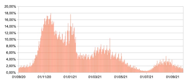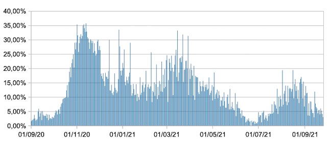 Il grafico mostra la percentuale di tamponi positivi giornalieri su tamponi giornalieri testati ( diagnostici+quelli di controllo) nel periodo 1 settembre 2020 –25 settembre 2021 in Italia.