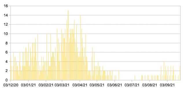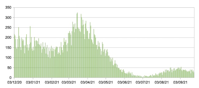 Il grafico seguente mostra i dati giornalieri relativi ai nuovi ingressi in terapia intensiva nelle Marche 3 dicembre 2020 – 25 settembre 2021.