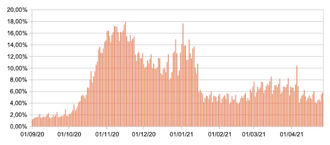 Il grafico mostra la percentuale di tamponi positivi giornalieri su tamponi giornalieri testati ( diagnostici+quelli di controllo) nel periodo 1 settembre 2020 – 26 aprile 2021 in Italia.