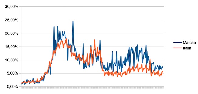 Il grafico seguente illustra l’andamento della percentuale giornaliera di nuovi casi positivi rispetto al corrispondente numero di tamponi (diagnostici +quelli di controllo) effettuati a livello nazionale e nella regione Marche nel periodo 1 settembre 2020 – 26 aprile 2021.