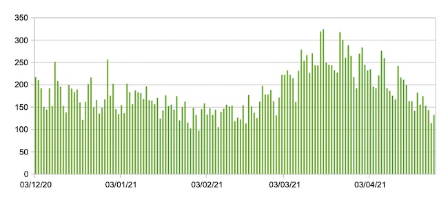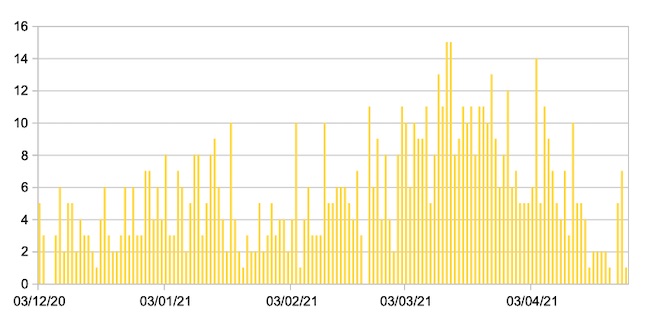 Il grafico seguente mostra i dati giornalieri relativi ai nuovi ingressi in terapia intensiva nelle Marche 3 dicembre 2020 – 26 aprile 2021.
