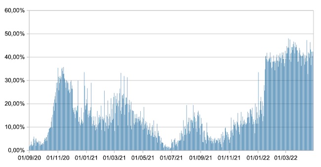 Il grafico mostra la percentuale di tamponi positivi giornalieri su tamponi giornalieri testati ( diagnostici+quelli di controllo) nel periodo 1 settembre 2020 –28 aprile 2022 in Italia.