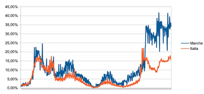 Il grafico seguente illustra l’andamento della percentuale giornaliera di nuovi casi positivi rispetto al corrispondente numero di tamponi (diagnostici +quelli di controllo) effettuati a livello nazionale e nella regione Marche nel periodo 1 settembre 2020 – 28 aprile 2022.