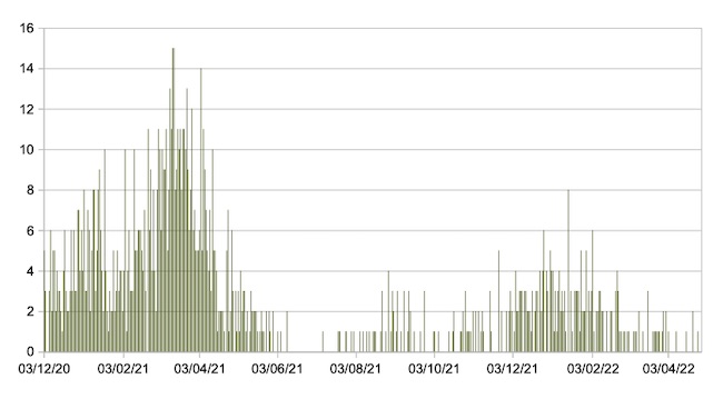 Il grafico seguente mostra i dati giornalieri relativi ai nuovi ingressi in terapia intensiva nelle Marche 3 dicembre 2020 – 28 aprile 2022.