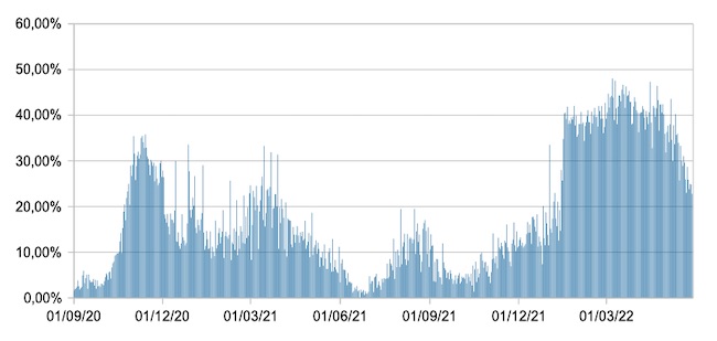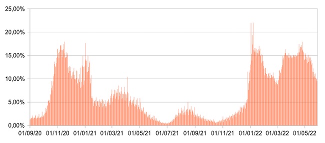 Il grafico mostra la percentuale di tamponi positivi giornalieri su tamponi giornalieri testati ( diagnostici+quelli di controllo) nel periodo 1 settembre 2020 –28 maggio 2022 in Italia.
